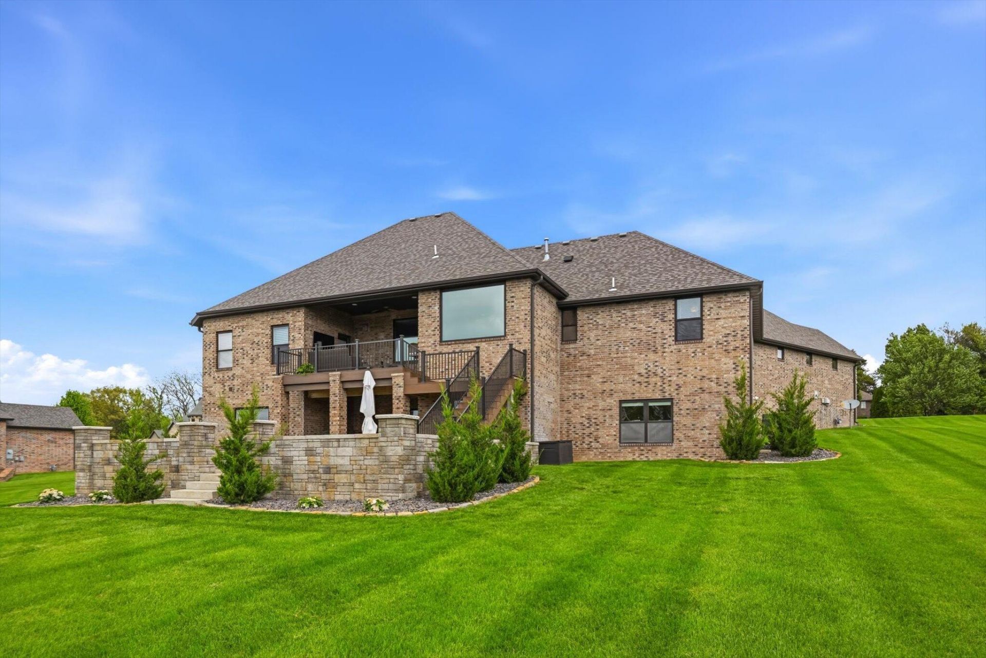 Welcome to 4702 Cobble Creek Drive, a pristine residence offering refined design, a thoughtful split-bedroom layout, and exceptional indoor-outdoor living within East Springfield's Cobblestone Creek gated community. Encompassing over 4,500 square feet, this home features 6 bedrooms, 3 full bathrooms, a powder room, and multiple living areas designed for both comfort and entertaining. The main level showcases a light-filled, open-concept layout anchored by rich wood flooring and a striking floor-to-ceiling fireplace. Expansive windows with automatic blinds bring in abundant natural light. The kitchen blends style and function with crisp white cabinetry, marble countertops, stainless steel appliances, an oversized island, and a walk-in pantry. The split floor plan offers three bedrooms on the main level, including a spacious primary suite with tray ceiling, transom windows, automatic blinds, and a spa-inspired bath with dual vanities, soaking tub, walk-in tiled shower, and a large custom closet. Two additional bedrooms are positioned on the opposite side near a full bath, powder room, and laundry. The walkout basement adds three more bedrooms and flexible living space. The sixth bedroom is ideal for a theater, game room, or gym. A second living area with fireplace and wet bar creates the perfect setup for entertaining or guests. A storm shelter and a separate unfinished space provide ample storage and convenient access to the home's mechanical systems. Outdoors, enjoy a newly constructed expansive patio, Trex decking, and custom stairs overlooking the beautifully maintained open 0.65 acre lot with lush lawn, sprinkler system, and landscaped grounds.With a seamless blend of sophistication, scale, and livability, this home delivers a polished experience both inside and out. New roof installed summer of 2025.